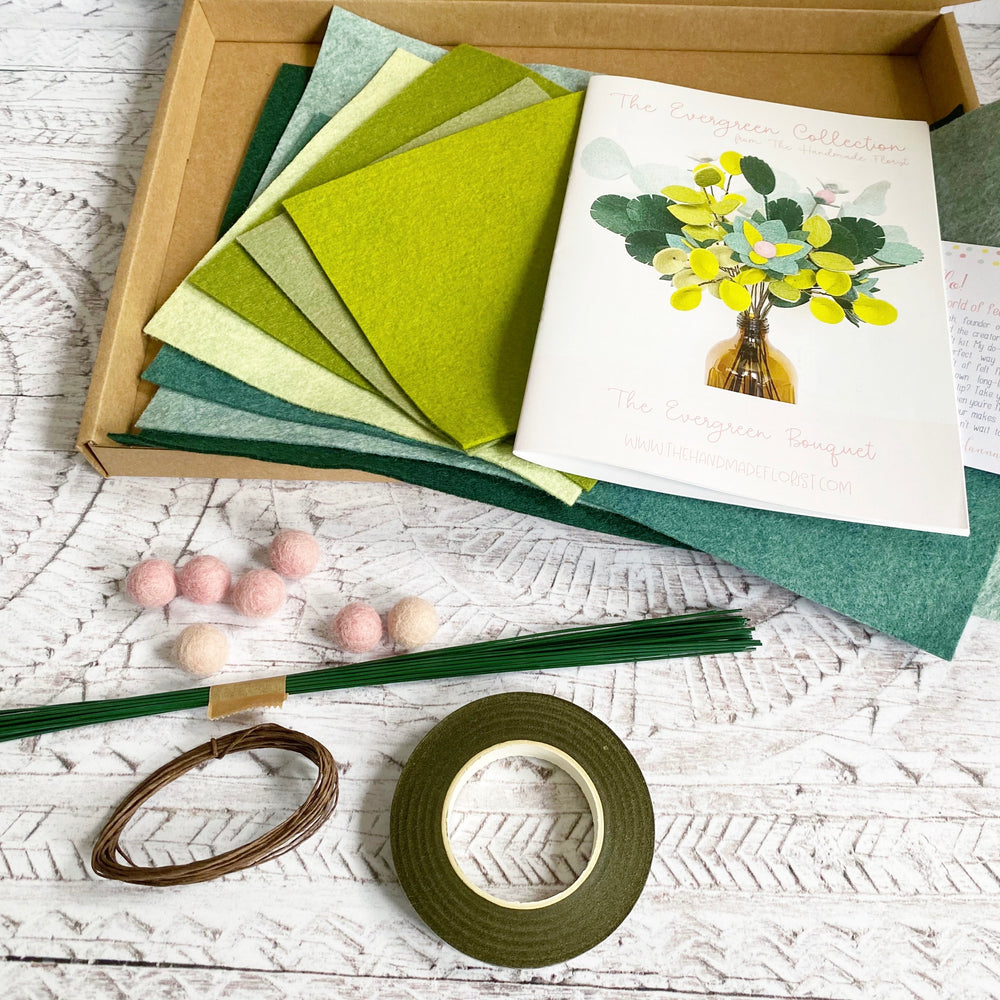 Meet the Evergreen Collection! This craft kit will take you step-by-step through making a fabulous felt foliage bouquet. Learn to make Silver Dollar and Gumdrop Eucalyptus stems, Tropical Leaves, Cactus Leaves, Two-Tone Pointed Leaves, Evergreen Blooms and Evergreen Bud Stems to create a statement bouquet for your home. The kit includes enough materials to make 22 stems (7 different varieties). No sewing required!